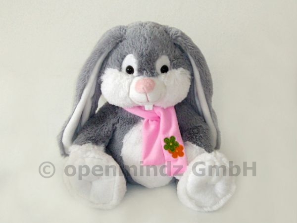 Hase Heike ist ein grau/weißer Plüschhase aus kuscheligem Plüschstoff. Der Hase ist ca. 25 cm groß. Heike hat große Ohren und einen rosafarbenen Schal. der Schal kann mit Ihrem individuellen Logo bestickt oder bedruckt werden - hier sehen Sie als Bsp. ein Blumenstick. Dieser Plüschhase kann natürlich auch in anderen Größen und mit anderen Stofffarben für Sie genäht werden. Fragen Sie uns einfach an, gerne setzen wir Ihre Änderungswünsche um.