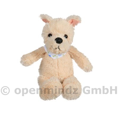 Plüschhund sitzend 13 cm weiß, mit weiß/blauem Halstuch