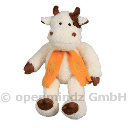 Plüschkuh weiß, mit braunen Flecken, 24 cm, mit orangem Schal