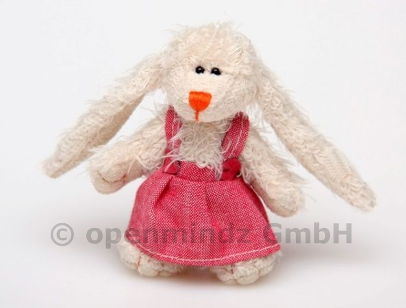 Plüsch Hase Jasmin trägt ein rosa Kleid und hat große Schlappohren. Durch ihr Aussehen will man sie doch einfach knuddeln! Als Maskottchen wird sie die Herzen höher schlagen lassen. Mit individuellem Stick oder Druck als Sonderanfertigung aus Plüsch erhältlich.