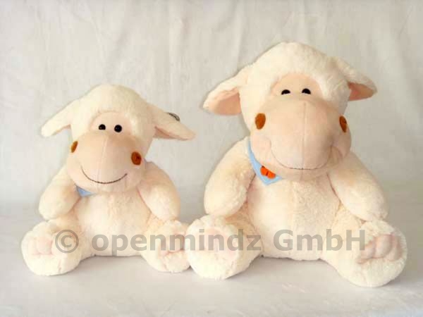 Plüsch Schaf Gisela steht bereit für Ihre Werbezwecke! Sie ist in zwei Größen und als Plüsch Sonderanfertigung erhältlich, individuelle Bedruckung oder Bestickung ist möglich.